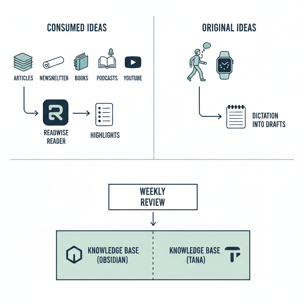 The first are ideas influenced by what I consume; articles, newsletters, books, podcasts, YouTube videos. These flow through Readwise Reader.